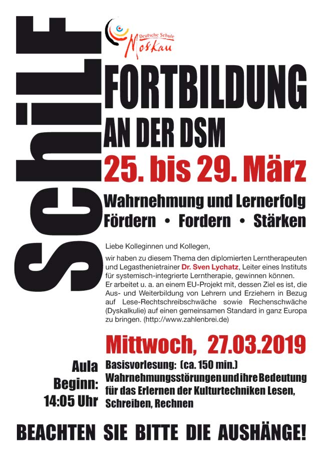 Deutscher Kindergarten, Grundschule, Gymnasium, verschiedene Fachschaften, Kollegium, Elternabend zu den Themen: LRS, Schreibstottern, Wahrnehmungsentwicklung, Förderung von Wahrnehmungsleistungen, Medienkonsum und die Auswirkung auf das Lernverhalten von Schülern, Wahrnehmungen und ihre Bedeutung für das Erlernen der Kulturtechniken Lesen, Schreiben und Rechnen, Spezifische Sprachentwicklungsstörung (SSES)
