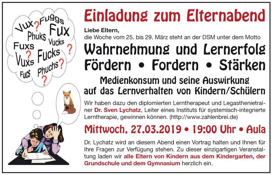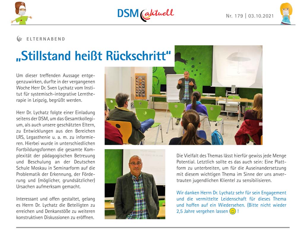 Um dieser treffenden Aussage entgegenzuwirken, durfte in der letzten Septemberwoche Herr Dr. Sven Lychatz vom Institut für systemisch-integrative Lerntherapie in Leipzig, begrüßt werden.